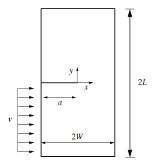 A plate with a single edge crack is studied. The specimen, shown in Figure 1, has dimensions L = 0.003 m and W = 0.0015 m and an initial crack with length a = 0.0015 m. The lower part of the specimen is subjected to an impulse load along the horizontal direction, which is modeled as a prescribed velocity: