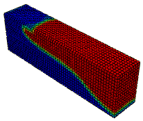 Visualization of material instances is based on output variable EVF, the Eulerian material volume fraction. Output variable EVF measures the amount of a particular material instance within an
