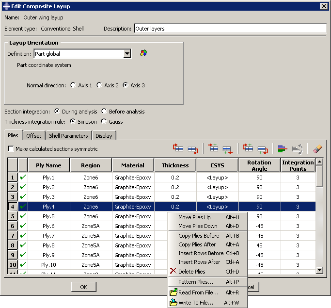 You create a composite layup in the Property module. The composite layup editor provides a table that you use to define the plies in the layup. For each ply you specify the ply's name, material, thickness, and orientation, as well as the number of integration points and the region of the model to which the ply is assigned. The composite layup editor's ply table is shown in Figure 1. ![]() The ply table provides several options that make it easier for you to define a layup containing many plies; for example, the ply table allows you to do the following: