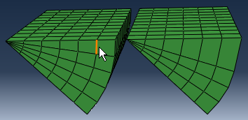 For structured meshes you can specify a thickness direction or reference edge to limit the edge directions considered for collapse. If you select a thickness direction, Abaqus/CAE uses the direction vector to measure the elements instead of measuring only the distance between nodes. If elements are oriented such that the direction is topologically ambiguous, Abaqus/CAE highlights the elements so you can either select a domain that excludes them or add a reference edge to further define the desired edges. When you choose a reference edge, with or without a thickness direction, Abaqus/CAE considers edges for collapse only if they are topologically parallel to the reference edge. A reference edge can be applied only within a single section of structured mesh; multiple separate sections must be handled in separate collapse operations if reference edges are required.