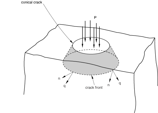 Figure 2 shows a crack front formed by the edge of a truncated cone along which the directions of both the vector and the normal to the crack plane are varying.