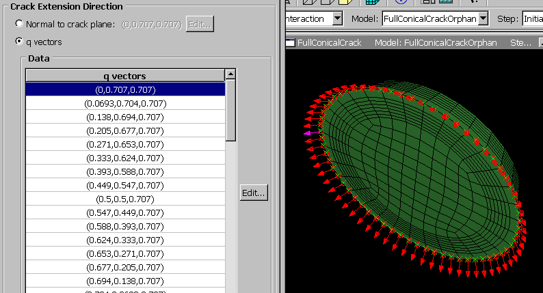 Edit the crack that was imported with the model. Each node along the crack front will have the crack extension direction defined by the vector that you specified in Step 1.