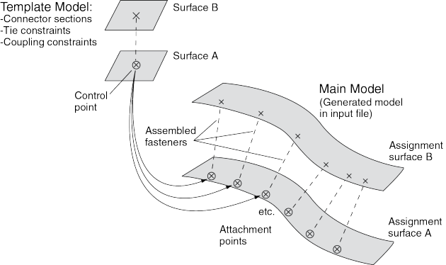 The control point must be a predefined set containing a single vertex or node in your template model. You must create this set in the template model before creating the assembled fasteners in your main model. When the template model is read in, the control point will be placed at the locations of your attachment points in the main model. The constraint surfaces in the template model must be mapped to corresponding surfaces in the main model to enable the constraint behavior in the main model. When you define the assembled fasteners in the main model, the Edit Fastener dialog box will automatically prepopulate the surface assignment table with any template model surfaces involved in tie constraints, coupling constraints, or adjust points constraints. The template surfaces are initially listed in ascending Z-axis order using the template model global coordinate system. You can change the order to coincide with your template fastener design; however, the ordering of the surfaces is not significant beyond the selection of the first surface, because the corresponding assignment surface normal is used to orient the assembled fastener. In the main model you must assign names to the surfaces that will be involved in the assembled fastener constraints. At each attachment point in the main model, the template model is positioned and translated so that the template model control point coincides with the attachment point. The template model is rotated into the main model and oriented such that the positive Z-axis of the global coordinate system of the template model aligns with the coordinate system you specify (on the Orientations tabbed page of the Edit Fasteners dialog box). The default is to orient the template model copies according to the normal vector of the first surface in the main model. This default orientation from the first surface normal creates a Z-axis alignment at every attachment point. The X-axis is then computed by projecting the global X-axis onto the surface. For any sets that you create in the template model, the main model will aggregate all of the sets' objects into a single set per assembled fastener. When the input file is generated by Abaqus/CAE, template model sets will be aggregated across all attachment points of the assembled fastener. For example, consider a template model that contains a connector section assignment for a wire set named Wire-1-Set-1, and that set contains a single wire. If the assembled fastener is then placed at 10 attachment points in the main model, the main model will have a set named TM-1_Wire-1-Set-1 that contains 10 wires. However, Abaqus/CAE generates these aggregated sets only when it creates the input file. The aggregated sets are not directly visible in Abaqus/CAE. Note: