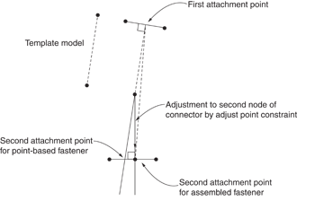 When the assembled fastener is instanced in the main model, Abaqus places the first node of the connector where the first projection point of the point-based fastener model is located. Both fastener types accomplish this placement with normal projections. However, for assembled fasteners an adjust point constraint is performed on the second node of the connector; i.e., a normal projection onto the second surface. This action is not the same as moving normal to the first projection point facet unless the two normals align perfectly. Therefore, the second (subsequent) attachment points can be different for assembled fasteners versus point-based fasteners, which will lead to differences in the analysis solution.