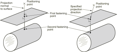 Select a positioning point and specify the direction vector along which the point is projected. The first fastening point is created where the vector intersects the closest face.