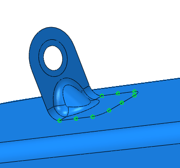Point-based fasteners make use of positioning points to create mesh-independent fasteners in Abaqus/Standard and Abaqus/Explicit, as described in Mesh-Independent Fasteners. A positioning point can be an attachment point, a reference point, or a node from an orphan mesh. Point-based fasteners modeling spot welds around the edge of a bracket are shown in Figure 1. The user first created attachment points at equally spaced intervals around the edge of the bracket. The attachment points were used to define the location of the fastener's positioning points.