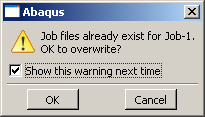 For example, if you submit a job for analysis and job files with the same name already exist, Abaqus/CAE displays a dialog box asking if it is OK to overwrite the job files, as shown below.