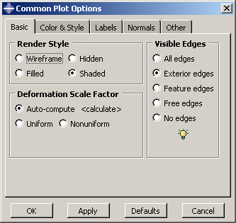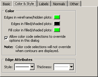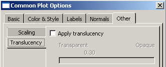 For example, Figure 1 displays the Common Plot Options dialog boxes. ![]() If you click the Color & Style tab, the dialog box containing the color and edge attributes options comes forward, obscuring the other four dialog boxes, as shown in Figure 2. ![]() In addition, separated dialog boxes can exist within a single dialog box. In this case the tabs of the separated dialog boxes are aligned vertically but work the same way as tabs aligned horizontally. In Figure 3 the Other dialog box contains two dialog boxes separated by tabs: Scaling and Translucency. ![]() The action buttons in a dialog box apply to the whole set of dialog boxes, not just the one you are currently viewing. If you click , all of the unapplied changes you have made in the set of dialog boxes are canceled, not just those in the current dialog box. Likewise, clicking saves all changes that you have made in any of the dialog boxes. |