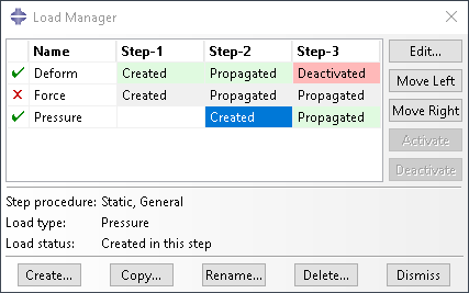 You cannot edit suppressed objects; however, you can copy, rename, and delete them. Symbols for suppressed objects are not displayed in the viewport. You can resume an object that was previously suppressed. If you attempt to resume an object that is not valid for a given procedure type, Abaqus/CAE displays an error message. You can use the manager or the Resume menu item from the main menu bar to resume the object. In the manager, click the red “X” to change the icon back to a green check mark and to remove the cell shading. Symbols for resumed objects are displayed in the viewport. You can also use the Model Tree to suppress or resume an object by clicking mouse button 3 on the object and selecting Suppress or Resume from the menu that appears. The Model Tree displays a red “X” next to an object to indicate that it is suppressed. For more information, see The Model Tree. |