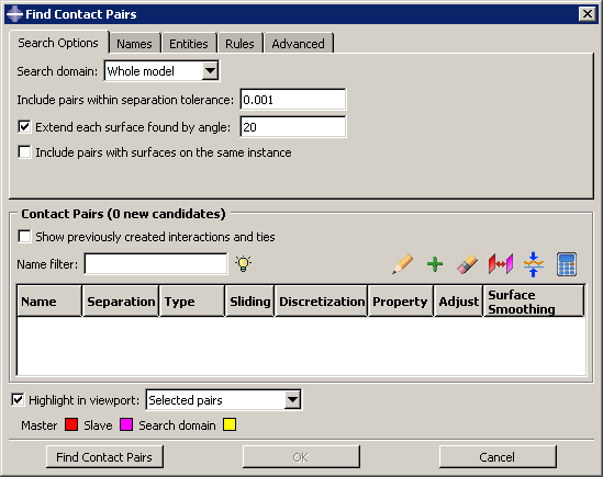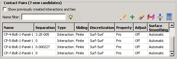 ![]() Using the contact detection tool is a two-step process: first Abaqus/CAE searches for surfaces in the model that are likely to interact; then you have a chance to review the identified surfaces and modify the default contact pair parameters before creating interactions and constraints. You provide some basic criteria to guide the search. These criteria include the search domain and the distance between surfaces that will likely be in contact. After entering the necessary search criteria, click Abaqus/CAE updates the contact pair candidates table, as illustrated in Figure 2. to begin the search.![]() You can create either a contact interaction or a tie constraint for each contact pair candidate in the table. You can also modify the parameters of the interaction or constraint definition by clicking on the appropriate table cell (see Figure 3). ![]() Clicking mouse button 3 on the table displays a menu of extended options and allows you to manually add contact pairs to the table. When you toggle on Show previously created interactions and ties, any pre-existing surface-to-surface interactions and tie constraints are added to the contact pair candidates table; you can modify existing contact pairs in the same manner as newly detected contact pair candidates. The interactions and constraints shown in the contact pair candidates table do not become part of the model until you click Abaqus/CAE simultaneously creates contact interactions and tie constraints for every contact pair in the table according to the specified parameters. The created interactions and constraints are added to the Model Tree and the Interaction Manager; you can review, modify, suppress, and delete the created interactions using either of these interfaces. . When you have finished setting parameters for the contact pairs, click .For detailed instructions on using the automatic contact detection tool, see Using contact and constraint detection. |