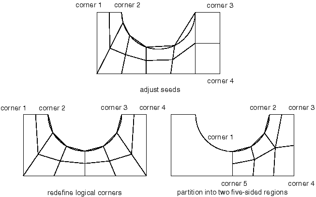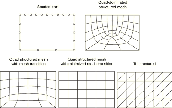 In general, structured meshing gives you the most control over the mesh that Abaqus/CAE generates. If you are meshing a four-sided region with all quadrilateral elements, the total number of element edges around the boundary must be even. For three- and five-sided regions, the constraint equations are more complex. Abaqus/CAE respects seed distribution wherever possible when generating a structured mesh. (Seed distribution describes the spacing of the seeds, not necessarily the number of seeds. For example, are the seeds evenly spaced along an edge or more concentrated at one end?) However, meshes must be compatible across regions, and Abaqus/CAE may adjust the nodes of a mesh region that is adjacent to a region that was meshed using the free meshing technique. As a result, the element nodes may not match the seeds exactly. Figure 2 shows the seeds on the edges of a four-sided region and the effect of different mesh controls. ![]() The mesh control effects are as follows:
