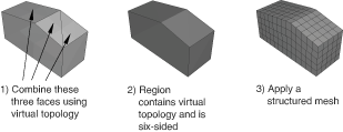 If a region cannot be meshed using the structured meshing technique, you can use virtual topology to combine faces until the region is bounded by six sides. Figure 7 shows how you can use virtual topology to create a six-sided region that can be meshed using the structured meshing technique.