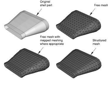 When Abaqus/CAE applies mapped meshing, it makes small adjustments to the mesh seeding to ensure that opposite sides of the rectangular region have the same number of seeds. If your model is large and includes many simple regions, it may take slightly longer for Abaqus/CAE to check for rectangular regions and adjust the seeds to produce a mapped mesh than to produce a mesh without mapped meshing. However, for most models the time difference to include mapped meshing is not significant compared to the improvement in mesh quality. Figure 1 shows a shell part meshed with triangles using the following mesh techniques and algorithms available in Abaqus/CAE: