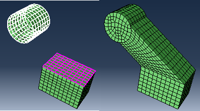 The extrude method is a special case of the sweep method with a linear path defined by a direction and a distance. The extrude method is illustrated in Figure 3. You should use the extrude method for regions with a constant cross-section and a linear sweep path. There are three required parameters for a bottom-up extruded mesh. As with the sweep method, you choose the Source side that defines the area on which Abaqus/CAE will create a two-dimensional mesh. You then select the starting and ending point of a Vector that defines the extrusion direction and can also be used to define the extrusion distance. Finally, you indicate the Number of layers to define the number of elements between the source side and the end of the extruded mesh. If you use the vector to define the extrusion distance, the definition is complete. However, you can Specify a distance or use Project to target and select a target side to define the extrusion distance. The target side can be selected from any geometry, mesh, or datum plane in the viewport; it need not be part of the same part instance as the source. Abaqus/CAE extrudes the two-dimensional mesh from the source side in the direction of the extrusion vector. If you select a target side to define the extrusion distance, Abaqus/CAE ends the extruded mesh at the target side. Figure 1 shows the source side and target side on the left; the extrusion vector (not shown) extends from the center of the rectangular source side to the center of the cylinder. The resulting extruded mesh is an extension of the source side mesh. It closely matches the target side shape, but no attempt is made to match the node positions of the mesh on the target side.