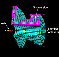 The revolve method is another special case of the sweep method. In this case the sweep path is a circular path defined by an axis and an angle of revolution. The revolve method is illustrated in Figure 2. You should use this method for regions with a constant cross-section and a circular sweep path. As with the sweep and extrude methods, you choose the Source side that defines the area on which Abaqus/CAE will create a two-dimensional mesh. The source side cannot intersect the axis of revolution, but it may contain edges that coincide with the axis. If so, the elements contacting the axis create a layer of wedge elements in the revolved mesh. The source side should not include any triangular elements along the axis of revolution. You then select the starting and ending point of an Axis that defines the axis of revolution. Finally, you indicate the Angle and the Number of layers to define the number of elements between the source side and the end of the revolved mesh. Abaqus/CAE revolves the two-dimensional mesh from the source side by the specified angle and evenly divides the resulting region into the desired number of element layers. The direction of revolution is clockwise if you look along the axis of revolution from the starting point to the ending point.