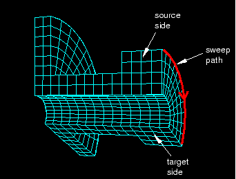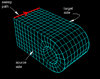 Abaqus/CAE can apply the swept meshing technique to solid regions that can be replicated by sweeping a source side along an edge to the target side. For a three-dimensional solid the sweep path is an edge, but the source and target sides are faces. Figure 1 illustrates an extruded swept mesh—Abaqus/CAE meshes the source side and extrudes that mesh along an edge to the target side. Figure 2 illustrates a revolved swept mesh—Abaqus/CAE meshes the source side and revolves that mesh about the axis of the circular edge to the target side.