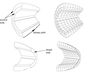 Figure 1. The extruded swept meshing technique sweeps the mesh on the source side along an edge. Figure 2. The revolved swept meshing technique sweeps the mesh on the source side along a circular edge.