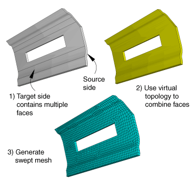 You may be able to use virtual topology to combine faces on the target side to make a part swept meshable. Figure 7 illustrates a part that was swept mesh after the five faces on the target side were combined into a single face using virtual topology. However, because the part now contains virtual topology, it can be swept meshed with only the advancing front algorithm.