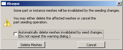 Do not delete the mesh yourself; instead, attempt to seed the part, part instance, or region of interest. As soon as you select the parts or edges to seed, Abaqus/CAE displays a window similar to the following: