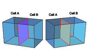 When you select an internal face to create a surface, the surface side is ambiguous. For example, the highlighted face in Figure 6 could be either the right side of cell A or the left side of cell B.