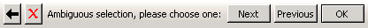 When your selection is ambiguous, Abaqus/CAE displays buttons in the prompt area that allow you to cycle through all of the possible selections, as shown here: