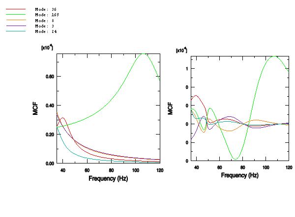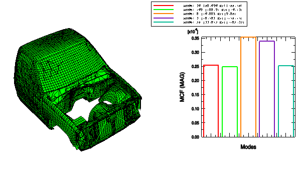 The Options tabbed page is shown in Figure 3: ![]() The plug-in creates each type of plot in a separate viewport and names the viewport accordingly. As a result, you can select Coupled acoustic-structural analysis of a pick-up truck. The variable selected was POR, and the bar graph, polar graph, and vector graph and the ranks were generated for a frequency of 35 Hz. The analysis examined the first five ranked modes (out of 180): from the main menu bar to view all the plots at the same time. The following figures were created by the plug-in using the output database generated by a modified version ofFigure 4 shows the model that was analyzed. The bar graph indicates that Mode 36 is the significant mode at this frequency. ![]() Figure 5 shows the X–Y plot and the projection plot. The X–Y plot shows the magnitude of the modal contribution factor at all frequencies. The projection plot shows the projection of the modal contribution factor on the total response at all frequencies. For example, mode 169 becomes more significant at 110 Hz. ![]() Figure 6 shows the polar graph and the vector graph. The bar graph shows that the magnitude of mode 36 is less than the magnitude of mode 8; however, the polar plot shows that mode 36 is more in phase with the total response (the vector sum of all the modal contributions). As a result, mode 36 contributes more to the total magnitude than mode 8 at 35 Hz and consequently ranks higher. ![]() |