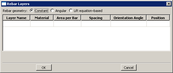 To display context-sensitive help for items in the Rebar Layers dialog box, you must select the item of interest and then press F1. (The menu in the main menu bar is unavailable while the option dialog box is displayed.) Once you have entered all the data necessary to define the section, you can click to close the section editor and to save the section.For detailed instructions on using section editors, see the following sections : |