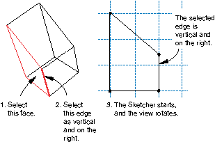 When you add a feature to a three-dimensional part or assembly, you must use the following technique to control the orientation of the view relative to the Sketcher grid: