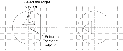 You can rotate selected edges by specifying the coordinates of the center of rotation and entering the angle of rotation; a positive angle indicates a counterclockwise rotation. Figure 2 shows the selected edges, the selected center of rotation, and the result of a 90° rotation. The selected edges are not connected or otherwise constrained to other edges in the sketch, so the constraint solution method has no effect on the rotation.