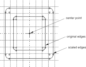 You can scale selected edges by specifying a center point and a scale factor. A scale factor less than 1.0 decreases the spacing between the edges, and a scale factor greater than 1.0 increases the spacing between the edges. Figure 4 shows the selected edges, the selected center point, and the result for a scale factor of 1.5.