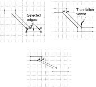 You can translate selected edges by specifying the start and end coordinates of a translation vector. The translation vector can start from any point; however, you may find it more meaningful to start the vector from the vertex at one end of a selected edge and end it at the vertex's new location. Figure 1 shows the selected edges, the translation vector, and the result of the translation. To achieve the results shown, Fixed constraints were added to prevent the two vertices of the upper rectangle from moving.