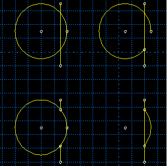You can trim an intermediate or end segment from a line, arc, circle, or spline curve. Auto-trim is the fastest method you can use to remove unwanted edge segments from a sketch. Abaqus/CAE uses preselection to highlight edges that you can remove. Preselection is based on cursor proximity and the two nearest trim points. Trim points include intersection points, endpoints, vertices, and the picked points that define the edges of circles. Unlike when you use Trim/Extend, Abaqus/CAE does not split the intersecting edges. Figure 2 shows several possible trim combinations based on the circle and line shown in the upper left corner.