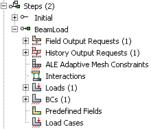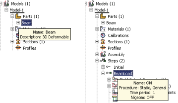 For example, the Steps container contains all the steps in your model. In the example shown in Figure 1 expanding the Steps container reveals that the model contains two steps—the Initial step and the BeamLoad step. Expanding the BeamLoad step, as shown in Figure 2, reveals that the step has four containers, each of which contains a single item—Field Output Requests, History Output Requests, Loads, and BCs. ![]() In addition, the step contains four empty containers—ALE Adaptive Mesh Constraints, Interactions, Predefined Fields, and Load Cases. You cannot delete an empty container from the Model Tree, although you can hide empty containers from view (see Changing the view of the model). Finally, expanding the Loads container, as shown in Figure 3, reveals a single load called Pressure that was created in this step. ![]() The arrangement of the containers and items in the Model Tree reflects the order in which you are likely to create your model. A similar logic governs the order of modules in the module menu—you create parts before you create the assembly, and you create steps before you create loads. This arrangement is fixed—you cannot move items in the Model Tree. For more information, see What is a module?. Abaqus/CAE underlines the current objects in the Model Tree and displays them in the context bar. The model you are working on is a current object. The current part or the current step is also a current object. When you select an item in the Model Tree, Abaqus/CAE highlights that item in the current viewport if the selected item belongs to the current objects. For example, if you select a load, Abaqus/CAE highlights the load in the current viewport if it was applied in the current step of the current model. Containers are not highlighted. You can select multiple items in the Model Tree, and Abaqus/CAE highlights each of those items if they belong to the current objects. For example, you can select an interaction and a load in the current step of the current model, and Abaqus/CAE highlights both the interaction and the load in the assembly. As you move the cursor over an item, the Model Tree displays some information about the item, as shown in Figure 4. In most cases the same information is available from the item's manager. ![]() Pressing an alphabetic key (a–z) when the cursor is in the Model Tree selects the first item in the tree with a name beginning with that character. Pressing subsequent keys continues to match characters in an item’s name. Table 1 describes all of the keyboard shortcuts that are available for navigation in the Model Tree; you can use these shortcuts to navigate in the Results Tree as well.