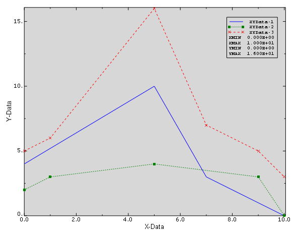 By default, the X–Y data objects you save are retained for the duration of the session only. If you want to make X–Y data objects available for subsequent sessions, you can save them to an XML file, to the model database, or to an output database using the option; or you can copy them to an output database file using the button in the XY Data Manager. Abaqus/CAE can display X–Y data in the form of an X–Y plot. An X–Y plot is a two-dimensional graph of one variable versus another. Examples of X–Y plots include temperature versus time, load versus displacement, and stress versus strain. You can display multiple X–Y data objects in one X–Y plot, and you can use the customization options to control the appearance of each data object and the overall appearance of the components of an X–Y plot. These components include the axes; the legend, which is a key that associates each X–Y curve in the plot with the X–Y data object it represents; and the X–Y curves. Figure 1 shows an X–Y plot displaying three X–Y data objects. ![]() |
