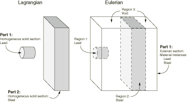 Context: The techniques for modeling pure Eulerian analyses in Abaqus/CAE are very different than those used to model pure Lagrangian analyses. Most notably, instead of defining several parts and assembling them into a complete model, Eulerian models typically consist of a single Eulerian part. This part, which can be arbitrary in shape, represents the domain within which Eulerian materials can flow. The geometry of bodies in the model is not necessarily defined by the Eulerian part; instead, materials are assigned to different regions within the Eulerian part instance to define the body geometries. Figure 1 compares the same model created using Lagrangian and Eulerian techniques. In the Lagrangian model, two parts are modeled, and each part is assigned a unique section referencing a material. In the Eulerian model, a single Eulerian part is modeled and assigned an Eulerian section. The Eulerian section defines the materials that can be present within the part. Materials are then assigned to different regions within the instanced part; any region without a material assignment is treated as a void with no material properties. ![]() The Eulerian analysis technique can be coupled with traditional Lagrangian techniques to extend the simulation functionality in Abaqus: