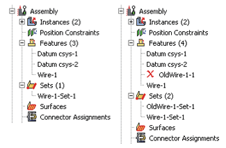 For example, Figure 1 shows that ![]() By using the default geometry set name created for a wire feature when you select wires to define connector section assignments, connector loads, and connector boundary conditions, you ensure that these objects remain valid if you modify the wire feature. Otherwise, objects that reference any part of the original wire feature are invalidated if you modify the wire feature; for example, if you define a connector force and select wires from the viewport or use a geometry set with a different name. You can remove wires from the wire feature by selecting Model Tree to delete or suppress the operation. from the main menu bar. The operation to remove wire edges from the feature is stored as a feature of the part; therefore, you can use the |