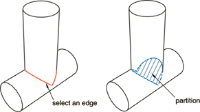 Context: If you select a curved edge or if you select two points connected by a curved edge, the corresponding edge of the resulting N-sided patch follows the contour of the edge. However, if you select points that are not connected by an edge, the patch simply connects the points; the patch will not follow the contour of the cell, and the partition may be incomplete. |