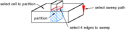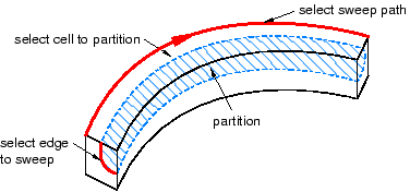 Use the Sweep along edge method to partition a cell by sweeping selected edges—the sweep profile—along a straight or curved edge—the sweep path. The sweep path must begin in the plane containing the sweep profile, and its tangent must be perpendicular to that same plane. The resulting partition will extend only as far as the sweep path. Sweeping a sweep profile along an edge to partition a cell is illustrated in the following figure: