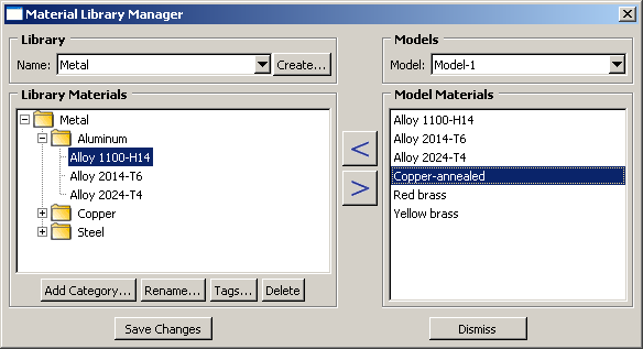 material. For example, you can name one material You cannot view or edit material properties within the material library manager. To view or edit the properties of a material, you must add the material to a model and use the Edit Material dialog box (for more information, see Creating or editing a material).