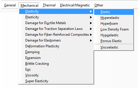 Context: Use the menu bar under the Material Behaviors list to add properties to a material. Some of the menu items contain submenus; for example, the following figure shows the behaviors available under the menu item: Note: