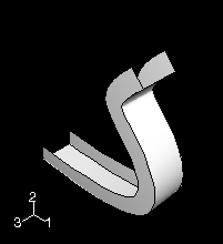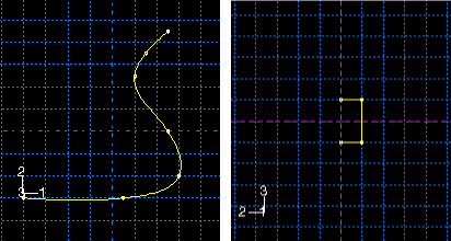 The sweep path (a spline) and the sweep profile are shown in the following figure: The sketch or set of edges defining the sweep path and the sketch, edge, or edges defining the sweep profile combine to define the swept shell feature; both the sweep path and the sweep profile can be modified using the Feature Manipulation toolset if you define them using the Sketcher. You can define a swept shell whose sweep profile is offset from the sweep path. In this case Abaqus/CAE moves the sweep path to a parallel location that passes through the sweep profile and creates the swept shell feature at that location. As you define your sweep feature, you can apply a twist or draft to it. For more information about these tools, see What types of features can you create?. You can toggle on Keep profile normal constant to maintain the same orientation for the sweep profile as it travels along the sweep path; if this option is toggled off, the sweep profile orientation changes with the normal to the sweep path. In addition, you can toggle on Keep internal boundaries in the Feature Manipulation toolset to maintain any faces or edges that are generated between the swept shell feature and the existing part. The internal boundaries can create regions that can be structured or swept meshed without having to resort to partitioning. |