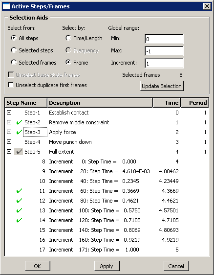 From the main menu bar, select ResultActive Steps/Frames. The Active Steps/Frames dialog box appears.