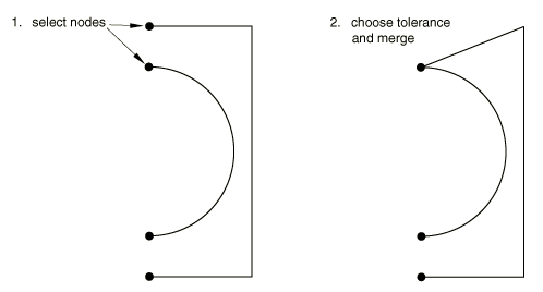 Abaqus/CAE enables you to choose the vertex that you want to remain stationary, and the merge operation moves any vertices within a specified tolerance radius across the gap to share the same point as your selected vertex. Figure 1 shows a simple merge operation, closing the upper gap between two sketcher objects.