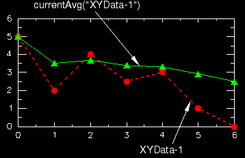 Use the currentAvg function to operate on a previously savedX–Y data object (a collection of ordered pairs) to produce a new X–Y data object. The new X–Y data object has the same X-coordinate values as the original X–Y data object, but new Y-coordinates are computed as the average of all Y-coordinates up to and including the current X-coordinate.
