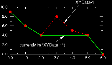 Use the currentMin function to operate on a previously savedX–Y data object (a collection of ordered pairs) to produce a new X–Y data object. The new X–Y data object has the same X-coordinate values as the original X–Y data object, but new Y-coordinates are computed as the minimum Y-coordinate at or before the current X-coordinate.