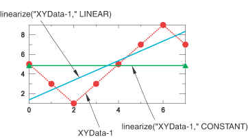 Use the linearize function to separate the Y-values of a previously savedX–Y data object (a collection of ordered pairs) into constant or linear components. The new X–Y data object produced by the linearize function contains exactly two points.