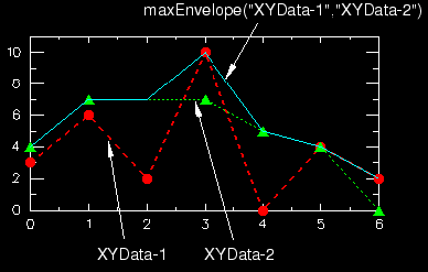 Use the maxEnvelope function to operate on two or more previously savedX–Y data objects (each object is a collection of ordered pairs) to produce a new X–Y data object. The new X–Y data object has as its X-coordinates all X-coordinates of the input data objects and any additional X-coordinates needed for alignment of the input data objects. Abaqus/CAE computes additional X–Y data pairs by interpolation and extrapolation. The new data object has as its Y-coordinates the maximum Y-coordinate of all input X–Y data objects at the current X-coordinate. The arguments of this operation are commutative.