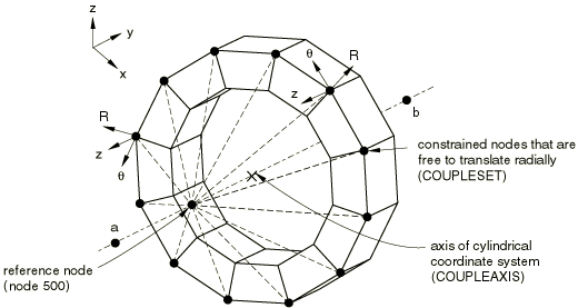 The kinematic coupling constraints are useful in cases where a large number of nodes (the “coupling” nodes) are constrained to the rigid body motion of a single node and the degrees of freedom that participate in the constraint are selected individually in a local coordinate system. In many such cases MPCs either are not available or must be prescribed individually for each constrained node. A typical example is shown in Figure 1, where a kinematic coupling constraint is used to prescribe a twisting motion to a model without constraining radial motions. In other applications the kinematic coupling constraint can be used to provide coupling between continuum and structural elements.