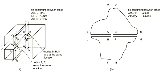 Tie constraint and symmetry boundary condition: At (B) nodes 141 and 151
