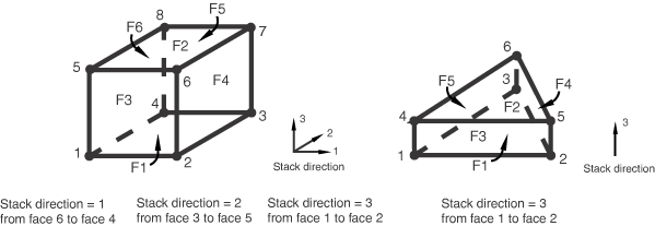Figure 3. Stack directions for COH3D8 (left) and COH3D6 (right) elements.